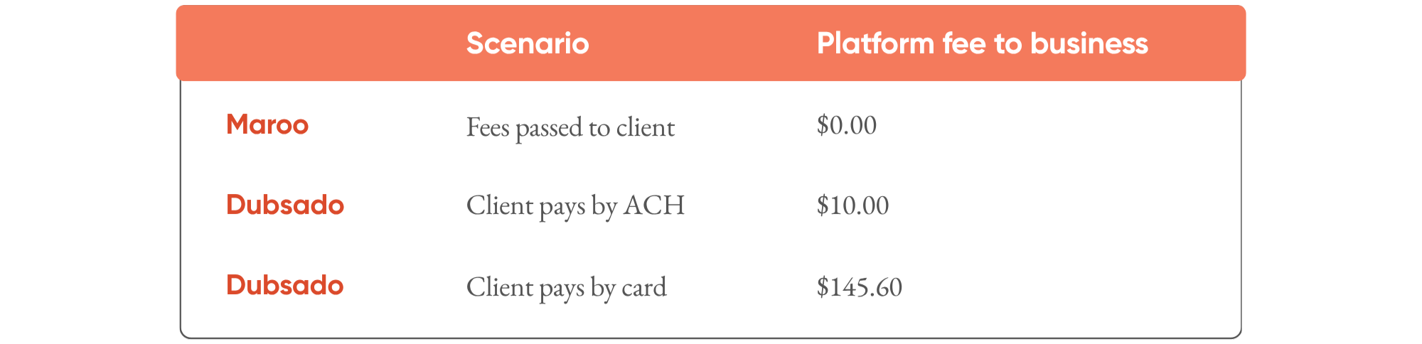 1. Zero processing fees out of pocket. This is the headline advantage. Maroo's fee-passing model means your business never absorbs card or ACH processing costs. On a $10,000 wedding package, a card payment through Dubsado (absorbed by you) costs $290.30. Through Maroo, it costs your business $0. At scale, this difference is dramatic.