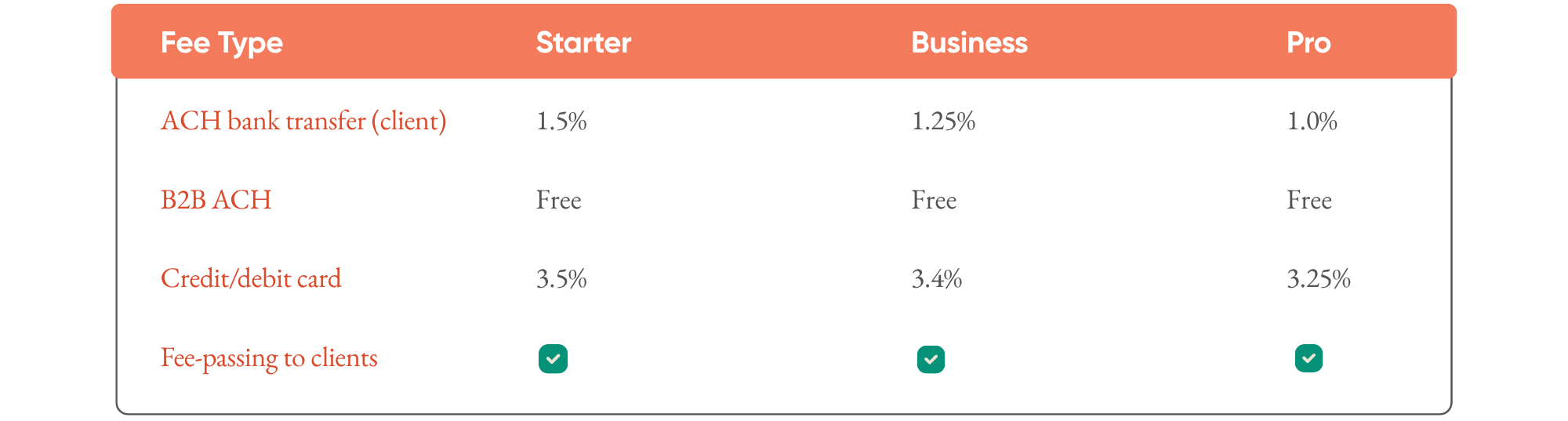 Maroo does have processing fees (1.0–1.5% for ACH, 3.25–3.5% for cards depending on plan), but they can be passed to clients at checkout, so your business doesn’t have to absorb them.