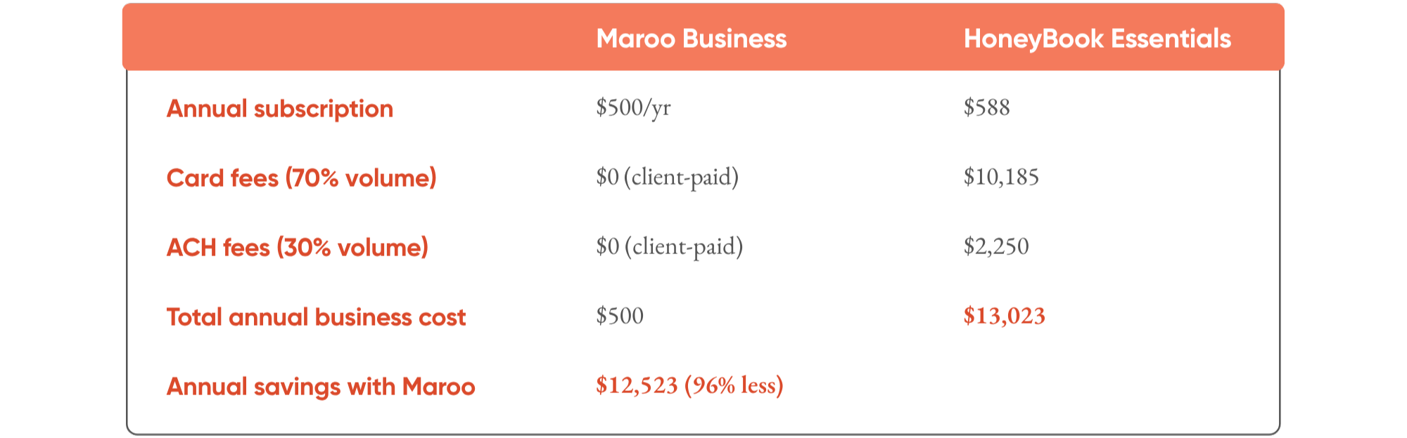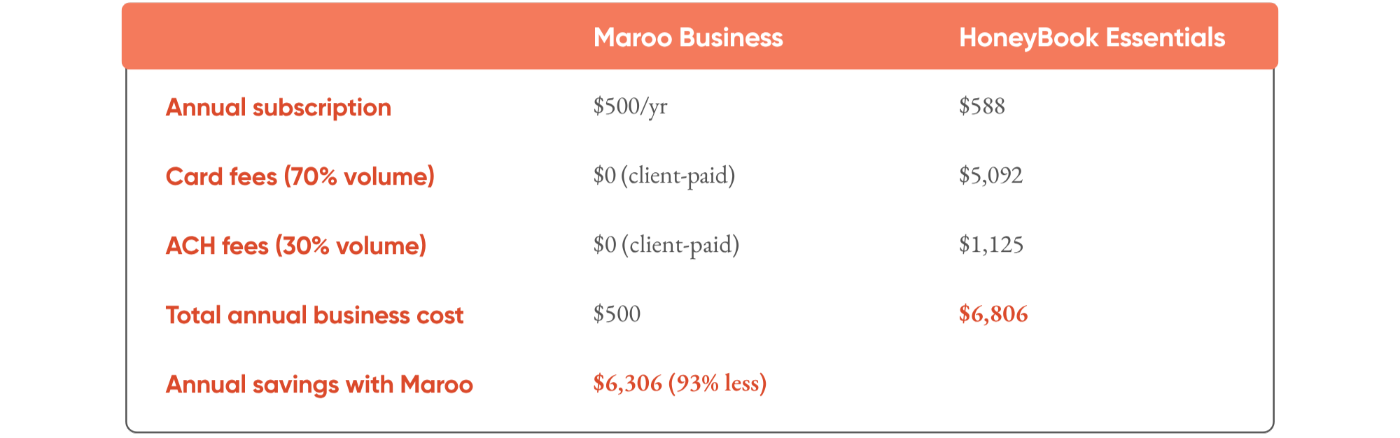 The critical distinction: HoneyBook's processing fees are a real cost absorbed by your business. Maroo's fees are passed to clients, so your business cost is the subscription only.