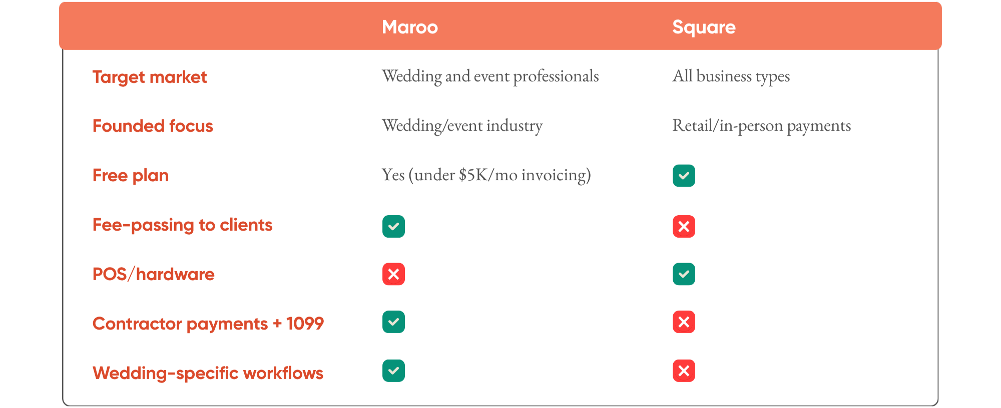 That's exactly why so many wedding and event professionals are searching "Maroo vs Square" in 2026. Not because Square is a bad product -- it's genuinely excellent for what it was built to do. But the wedding industry runs on large milestone payments, months-long client relationships, contractor payouts, and very specific cash flow patterns that a general-purpose POS platform was never designed to handle.