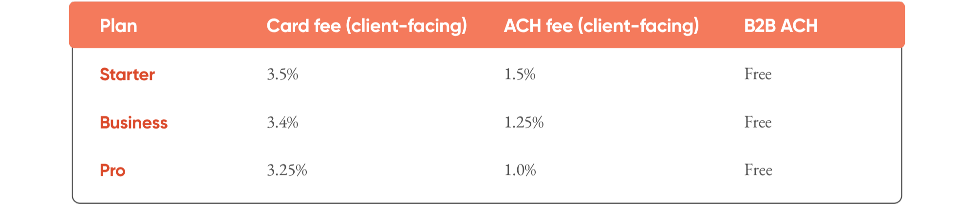 When a client pays a $4,000 deposit by credit card on Maroo Business, the 3.4% fee ($136) is added to the client's total -- your $4,000 lands in your account intact. If your clients prefer ACH bank transfer, the fee drops to 1.25%, which many clients will accept for a large payment. And if you're paying a vendor or second shooter via B2B ACH, that transfer is free on every plan.