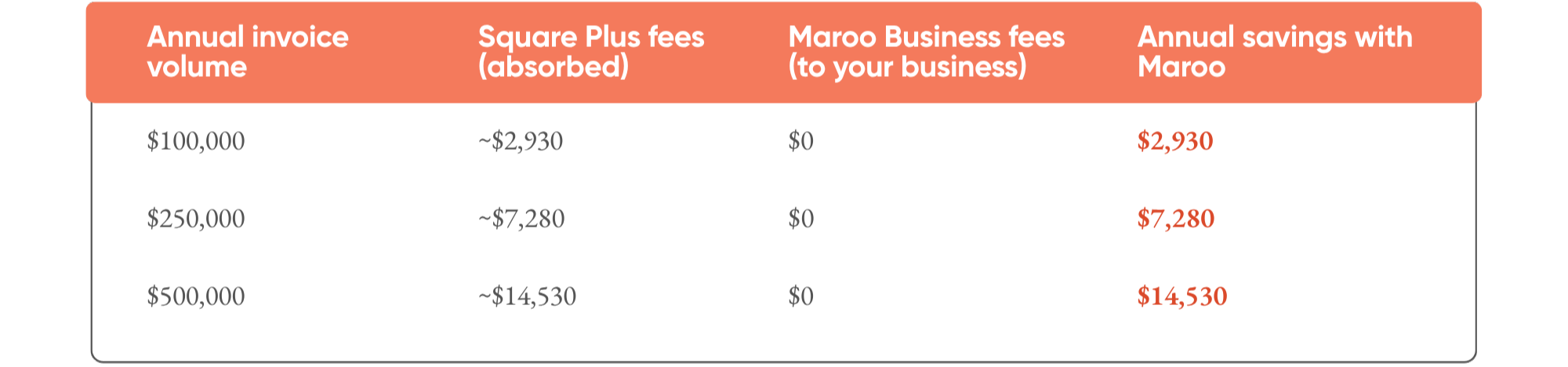 Assumption: All client invoices paid via credit card online. Square: 2.9% + $0.30 per transaction (Plus plan). Maroo: 0% to your business (fee passed to client).